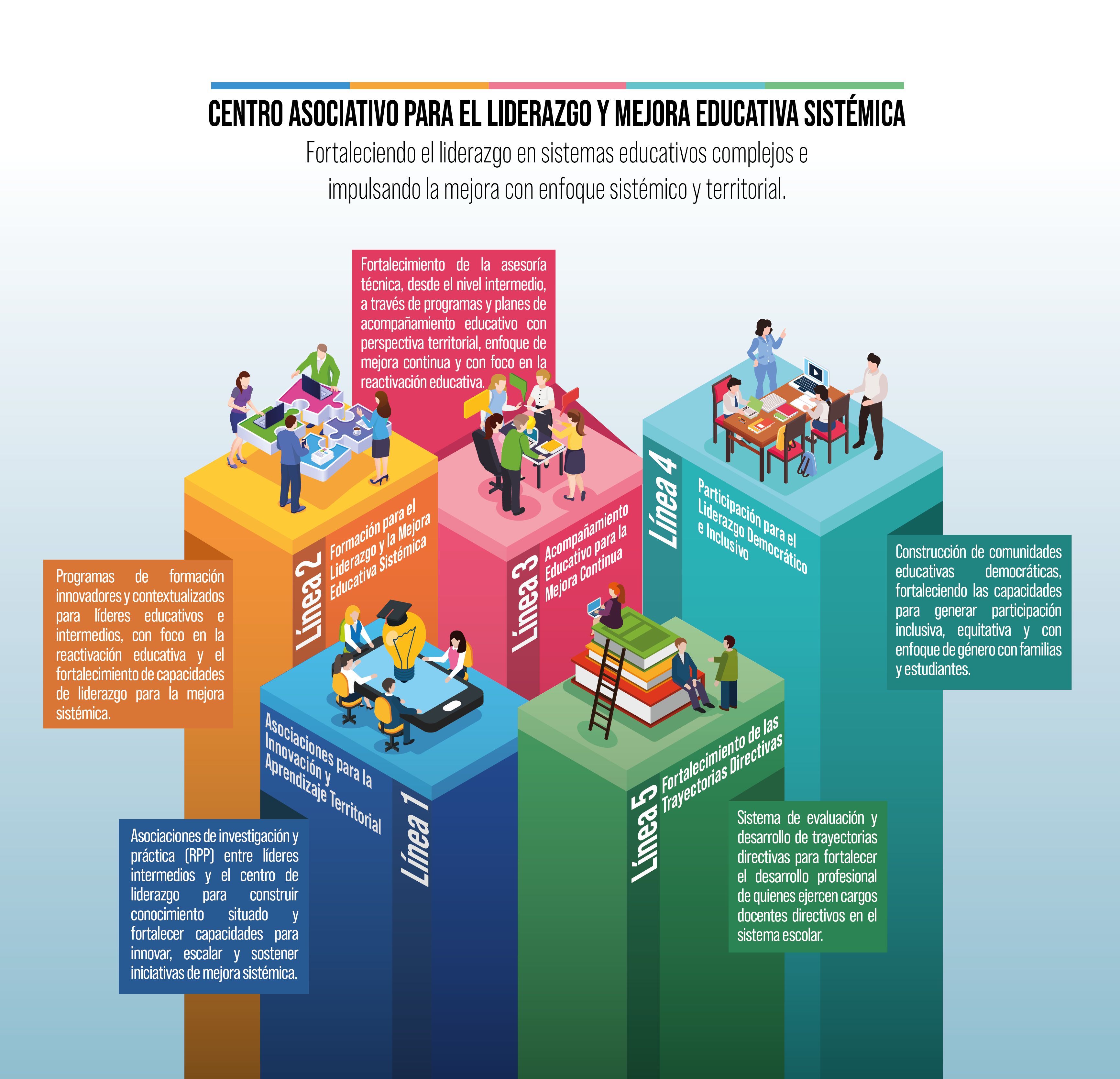Nuestro centro busca colaborar con el Ministerio de Educación para generar y afianzar prácticas de liderazgo sistémico y distribuido para la mejora educativa sostenible en los ámbitos prioritarios de convivencia y salud mental, fortalecimiento de aprendizajes, y asistencia y revinculación. Bajo estos grandes temas de la reactivación educativa, brindará asesoría directa y formación para el desarrollo de la trayectoria profesional de equipos de docentes directivos de establecimientos de educación inicial, básica y media, subvencionados por el Estado.